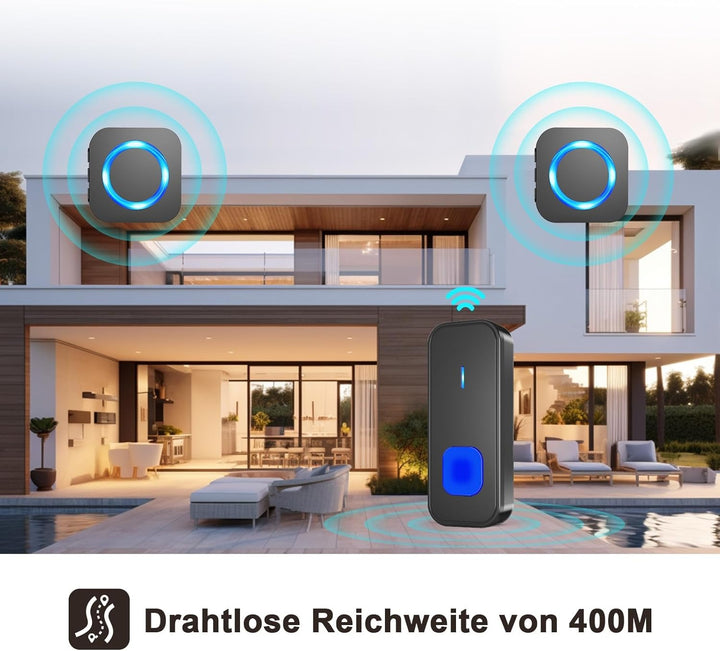 【Starker Empfang, Überall】Unsere Türklingel bietet eine leistungsstarke Reichweite von 400 Metern in offenen Bereichen, damit Sie immer erreichbar sind. Egal, ob Sie im Garten, oben im Haus oder sogar im Keller sind, verpassen Sie nie wieder einen Besucher!
