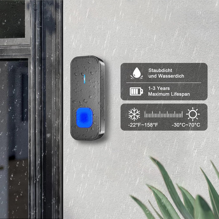 【Allwetterleistung】Unsere Funkklingel ist nach staub- und wasserdicht und hält Temperaturen von -30°C bis 70°C stand. Sie trotzt widrigen Bedingungen und punktet mit äußerst geringem Stromverbrauch für eine lange Batterielebensdauer.