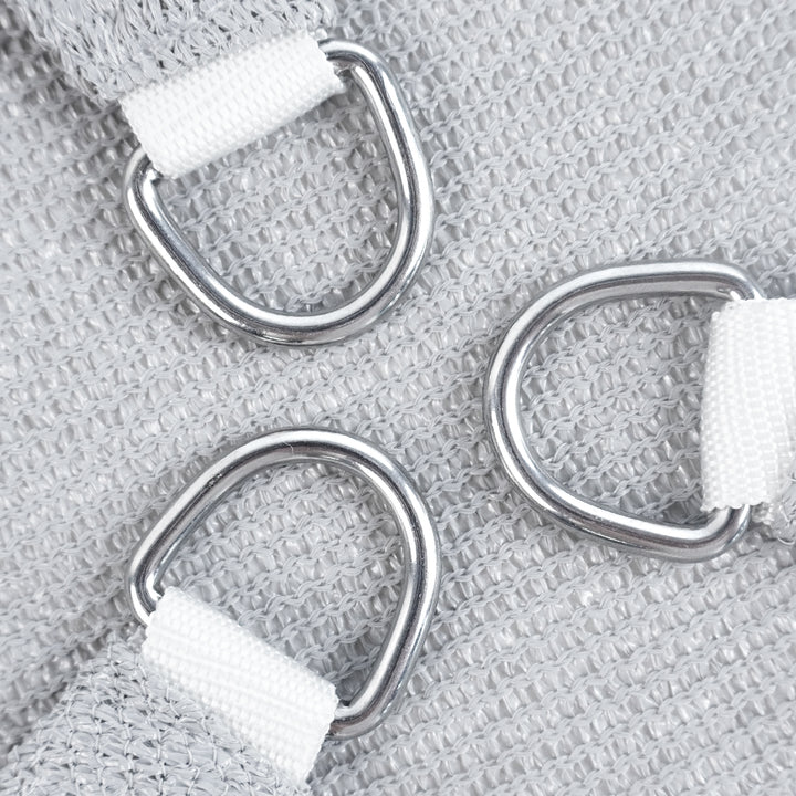 Instructions d'installation : mesurez la distance entre les anneaux en D ; laissez 45 à 60 cm pour le matériel entre l'anneau en D de la voile et les points de fixation ; envisagez de dimensionner la voile à 88 % des dimensions de la zone d'installation pour éviter qu'elle ne s'affaisse ; kit de matériel non inclus.